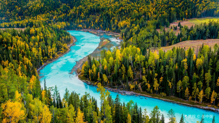 月亮湾位于卧龙湾上游约1公里,美丽静谧的月亮湾会随喀纳斯湖水变化而变化,确是嵌在喀纳斯河上的一颗明珠。喀纳斯河床在这里形成几个反“S”状弯河曲组成的半月牙河湾,被称之为“月亮湾”。。