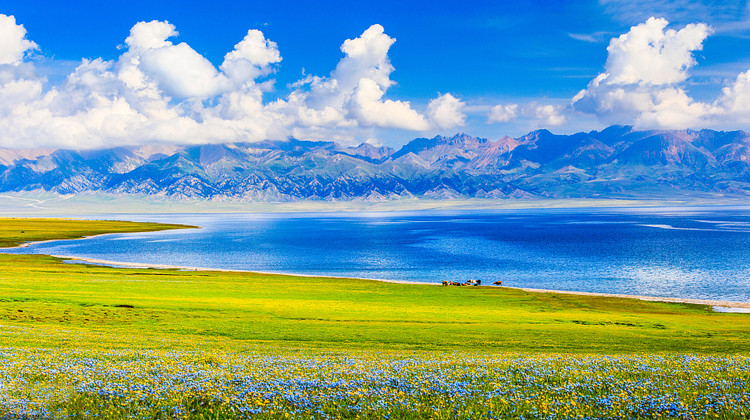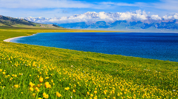 赛里木湖位于新疆西部的博尔塔拉蒙古自治州,背靠雪山。湖边是广阔的草原,湖水清澈蔚蓝,风光美不胜收,是新疆知名的几大景点之一。每年六、七月份就到了赏花季,届时湖边草原上开遍了各色的野花,是不可错过的盛景。