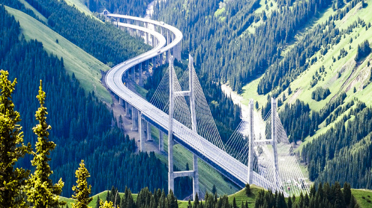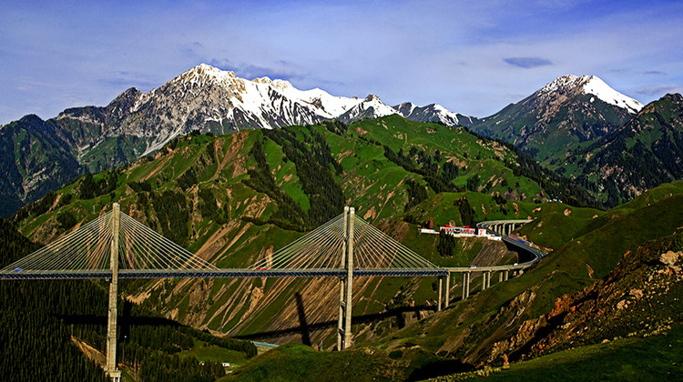 【温馨提示】果子沟大桥是双塔双索面钢桁梁斜拉桥,乘车沿路欣赏果子沟风光!果子沟大桥因交通管制,此点为乘车途观,不可下车游览。