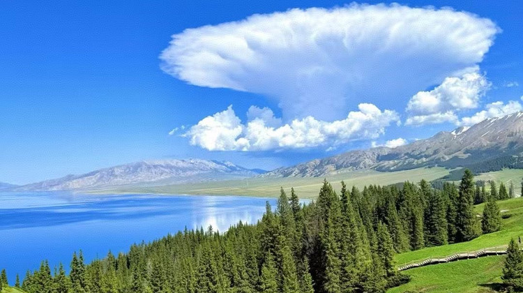3、抵达【天山天池】湖边后可游览【定海神针】、【南山望雪】、【西山观松】等,如当日天气晴好,可远眺天山雪峰【博格达峰】的神奇魅力。