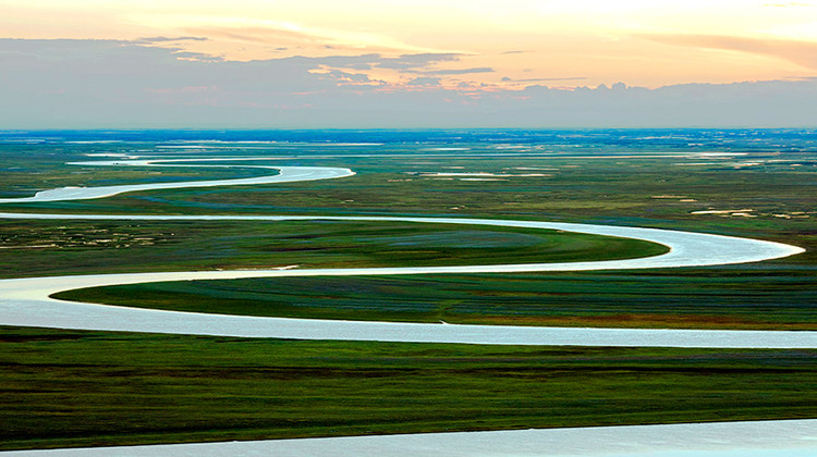 眼前呈现出一片辽阔的碧绿草原,牛羊成群、河流蜿蜒,远处有白雪皑皑、延绵无尽的雪山。乘车途径【拉尔敦达坂】。